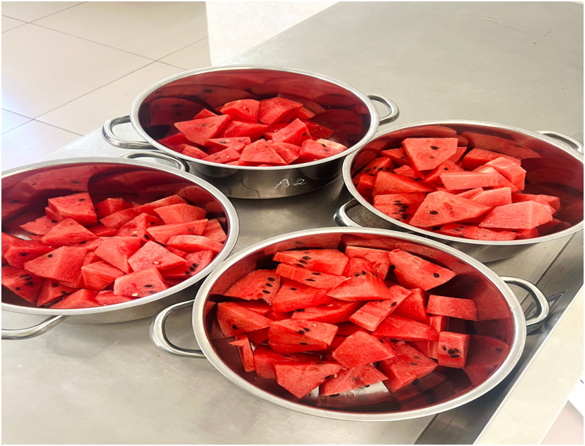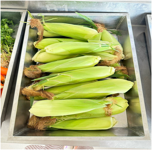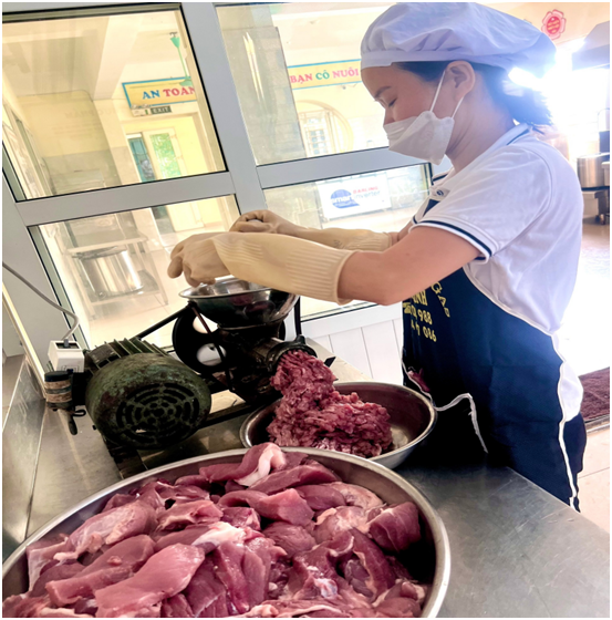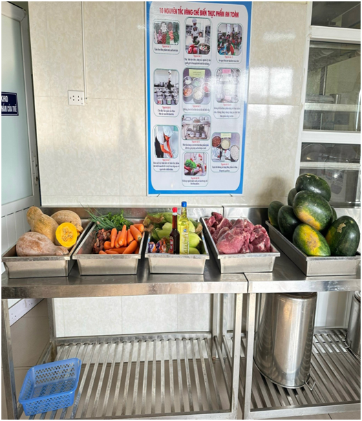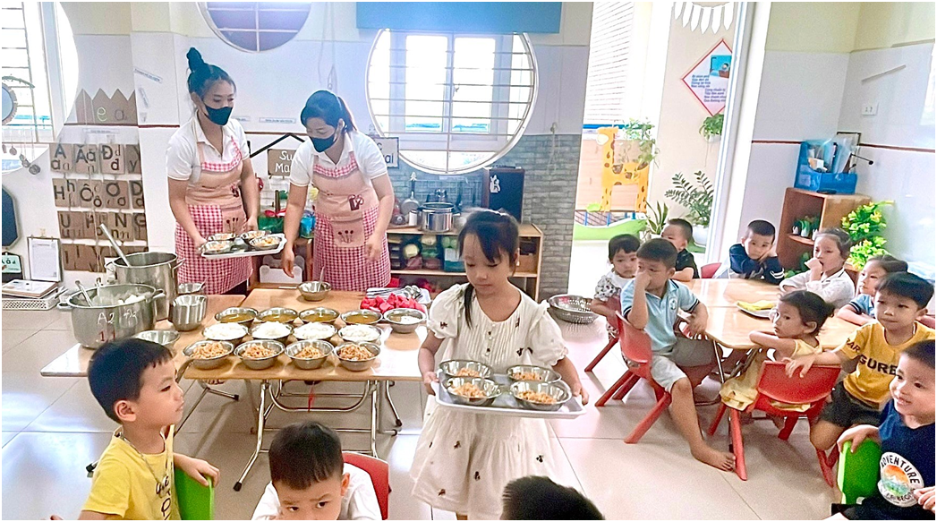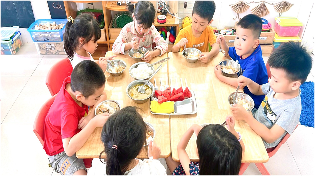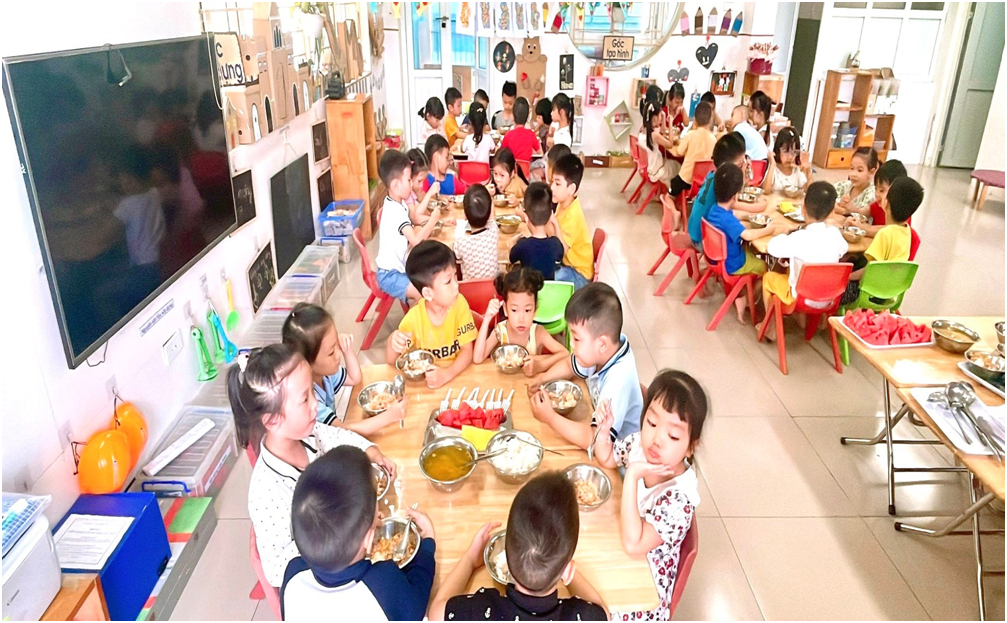 Nguồn thực phẩm được sử dụng cho trẻ hoàn toàn là thực phẩm sạch, an toàn. Nhà trường ký kết hợp đồng với công ty lương thực, thực phẩm có uy tín, đảm bảo vệ sinh an toàn thực phẩm và cam kết về mặt pháp lý. Quy trình giao nhận thực phẩm được thực hiện nghiêm túc, có đầy đủ thành phần theo quy định. Nhân viên nuôi dưỡng kiểm tra kỹ thực phẩm ngay sau khi giao nhận, đảm bảo thực phẩm luôn tươi ngon trước khi đưa vào sơ chế, chế biến cho trẻ; với những thực phẩm đóng gói như hàng khô được nhân viên nuôi dưỡng kiểm tra kỹ hạn sử dụng